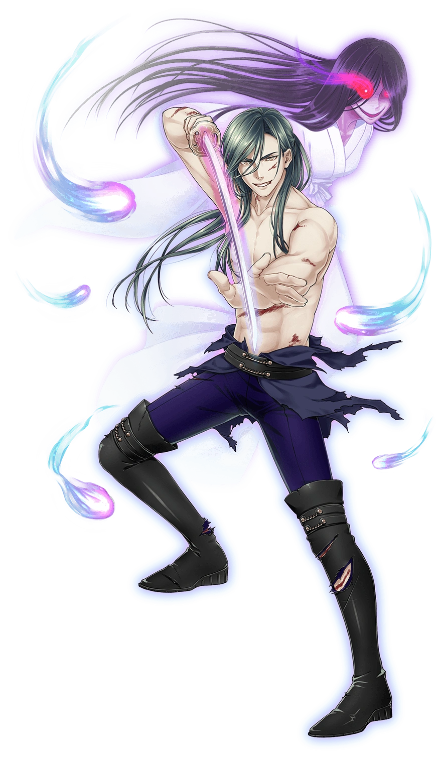 Tsukumogami: As the manifested soul of the sword Nikkari Aoe, he has advantages and disadvantages compared to a human, and is capable of demanifesting and remanifesting as a spirit - though he can only remanifest around his sword.